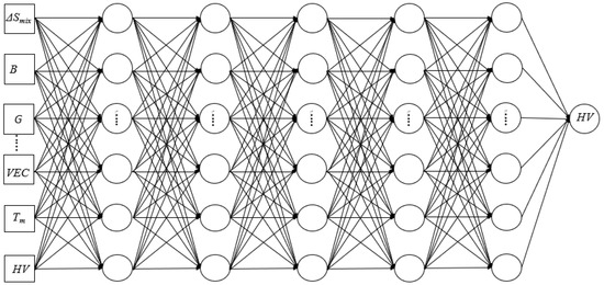 A schematic model of the neural network (NN) showing 5 hidden layers. The input consists of HEAs features as represented by square boxes on the left.