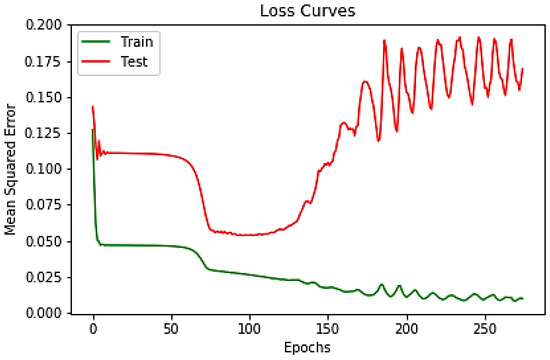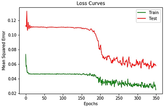 The best set of hyperparameter configurations obtained were learning rate = 0.001, weight decay for regularization = 0.001, momentum = 0.99, optimizers = stochastic gradient descent, nesterov = True, number of nodes per layer = 35, number of maximum epochs to train = 325, dropout probability per node = 0, and minibatch size = 1. The learning curves of hardness prediction are shown in Figure 3. The y-axis represents the mean squared error and the x-axis represents the number of epochs. It can be seen from the curve that the NN model was able to learn from the training data and predict the hardness of the samples for the validation data with a gradual decrease in loss over several epochs of training, starting from 0.125 and flattening out at around 0.0675. The NN model was trained on a dataset of 128 HEAs. There were also several models that diverged during training. An example case is shown in Figure 4.