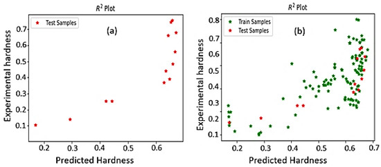 Hardness prediction by machine learning using the NN model for (a) the testing data and (b) both training and testing data. The red star symbol denotes the predicted hardness of the testing data, and the green star symbol denotes the predicted hardness of the training data.