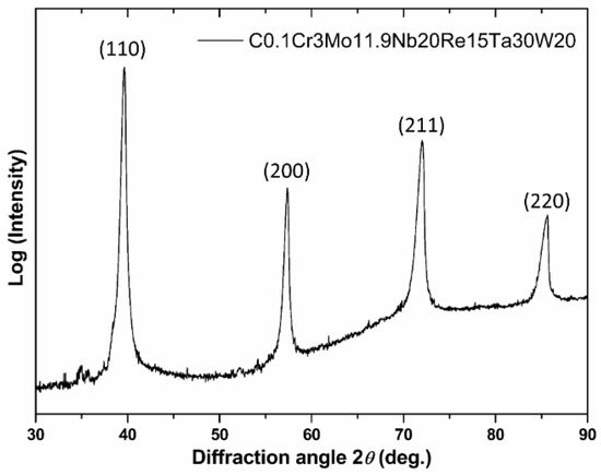 The XRD pattern of C0.1Cr3Mo11.9Nb20Re15Ta30W20 with the log intensity y-axis is shown in Figure 7. According to the image, each diffraction peak indicates most likely one single body-centered cubic (BCC) phase. No obviously distinguished peaks can be observed. This indicates the existence of a single-phase BCC phase in C0.1Cr3Mo11.9Nb20Re15Ta30W20. The wavelength of the X-ray is 1.5406 Å. With the help of Bragg’s law [42], described as