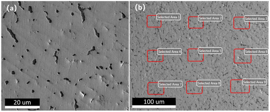 (a) SEM image of sample surface after polishing; (b) energy dispersive spectroscopy (EDS) testing areas on the sample surface.