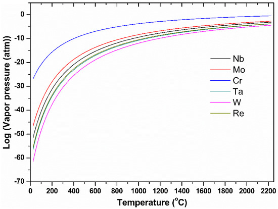 In addition, the difference of vapor pressure among the metal elements is another reason for the variation. As shown in Figure 9, the vapor pressure of the six elements from room temperature to ~2200 °C shows the following relationship [46], Cr > Mo > Nb > Re > Ta > W. Therefore, during the arc melting process, Cr and Mo were more volatile than the other elements, especially Cr.