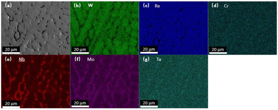 EDS mapping results of the sample C0.1Cr3Mo11.9Nb20Re15Ta30W20. (a) is the SEM image showing the area for EDS mapping analysis, (b–g) indicate the distribution of W, Re, Cr, Nb, Mo and Ta elements, respectively, on the sample area.