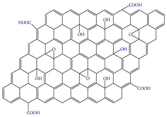 Ruan et al. [28] prepared GO by using Hummer’s method. At first, certain quantities of graphite powder and NaNO3 were placed into H2SO4 in a beaker under continuous stirring. Next, a certain quantity of KMnO4 was slowly added, heated and reacted under stirring. Finally, H2O2 was added to the above reaction mixture and washed with dilute HCl and deionized water [29,30,31]. Chang et al. [32] alreported the preparation of GO using the Staudenmaier method as follows. Graphite was added to a mixture of sulfuric and nitric acid. Potassium chlorate was added slowly to avoid a sudden increase in temperature and stirred at room temperature, filtered and washed repeatedly with HCl and deionized water. Tan et al. [33] demonstrated that graphite oxide could be prepared by the Hoffman method as follows. At first, sulfuric and nitric acid was cooled to 0 °C, and graphite was added with vigorous stirring. Next, within 30 min, KClO3 was added to the mixture, and the lid of the reaction flask was opened to release chlorine dioxide gas. The temperature was raised to room temperature, and after the mixture was continuously stirred for 96 h, 3 L of deionized water was added to the mixture. Then, deionized water and 5% hydrochloric acid were added to the mixed liquid separately, stirred into slurry and solid–liquid separation was realized by a centrifuge. Finally, it was dried in a vacuum oven for 48 h. The chemical structure of GO is shown in Figure 1.
