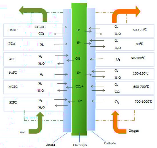 Fuel cells can be divided into six categories according to electrolyte, fuel and temperature, as shown in Figure 2 [71,76]. Alkaline fuel cells (AFC) use KOH solution as an electrolyte, which can operate at lower temperatures around 80 °C; PEMFCs and direct methanol fuel cells (DMFCs) use polymer membrane as an electrolyte to transport protons. Among them, PEMFCs use PEM and Pt as catalysts and need to work under acidic conditions [73]. The phosphoric acid fuel cell (PAFC) uses pure phosphoric acid as the electrolyte and works at 200 °C. Molten carbonate fuel cells (MCFCs) use molten carbonate as an electrolyte and the operating temperature can reach 650 °C. The solid oxide fuel cell (SOFC) uses ceramic (solid oxide) materials as the electrolyte to conduct oxygen anions from the cathode to the anode at a working temperature of 1000 °C [77]. In addition, microbial fuel cells are a new type of bioelectrochemical device which utilize a biocatalyst to convert the chemical energy stored in organic wastewater into power supply and remove pollutants while generating electricity [78]. However, microbial fuel cells have high production cost and low power density and energy conversion efficiency. The principle, electrode, catalyst, advantages and disadvantages of the fuel cells are shown in Table 2.