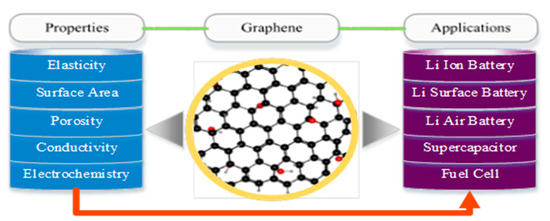 Graphene is a potential conductive agent for LIBs which has high electrical conductivity and flexible, two-dimensional, ultra-thin structural characteristics [98]. Through the "surface-point" contact mode between graphene and active materials, the low conductivity threshold of graphene allows a small amount of graphene to effectively increase the electronic conductivity of the electrode and greatly reduce the use of conductive agents as inactive materials, and this can effectively increase the volume energy density of the battery. Graphene has many applications in LIBs, as shown in Figure 3.