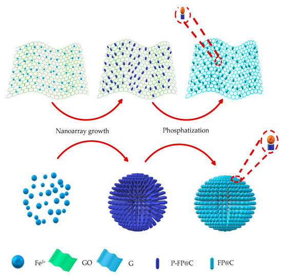 Hou et al. [106] fabricated G⊥FP@C-NA nanocomposites as the anode materials of LIBs (Figure 4). The structure of the materials was carbon-coated FeP nanorod array (FP@C-NA)grown vertically on the conductive reduced graphene oxide (G) network. Due to the unique structure of G⊥FP@C-NA, it exhibits obvious conductivity and structural stability in lithium storage. For example, this material provides high lithium storage capacity (1106 mA h g−1 at 50 mA g−1), excellent rate capability (565 mA h g−1 at 5000 mA g−1) and long-term cycle stability (1009 mA h g−1 at 500 mA g−1 after 500 cycles, 1310 mA h g−1 at 2000 mA g−1 after 2000 cycles). This attractive array structure design can also be extended to other different energy storage systems, which will promote the development of next-generation electrochemical energy storage devices with high power and high energy density.