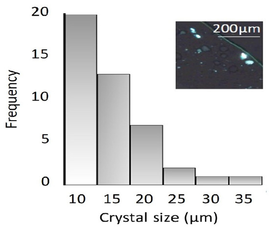 Size distribution of crystals in silicone grease. A small amount of sample was deposited under a cover slip and optical microscopy images of the drop were taken. The crystal size was calculated based on a single particle analysis carried out in ImageJ [43]. The insert in the upper right hand corner shows a photo of the lysozyme crystals embedded in the silicone grease.
