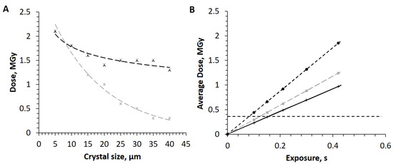 (A) Average dose received by the whole crystal (grey markers) and the average dose received by the volume of crystal interacting with the X-ray beam (black markers). The corresponding dashed lines are lines of best fit to guide the eye. (B) Average dose received by a whole crystal of 20 μm (black solid line), 15 μm (grey dashed line) and 10 μm (black dotted line) diameter as a function of the exposure time [40] The room temperature radiation damage limit for lysozyme is 0.38 MGy and is indicated by the horizontal black dashed line [48].