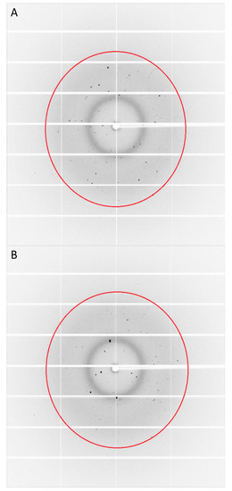 Diffraction images from a single crystal (Crystal 3) as it tumbles through the X-ray beam: (A) the first diffraction image collected, Frame 1; and (B) the last image collection in the series, Frame 18. The large red ring indicates the outer resolution limit of the diffraction pattern.