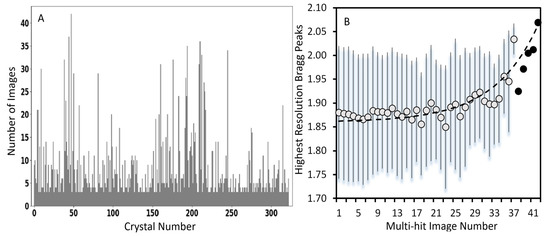 Multi-crystal sequence of events. (A) This plot shows the total number of images collected per single crystal for each of the 315 crystals that were hit multiple times as they passed through the X-ray beam. We found that the maximum number of images collected for a single multi-hit crystal was 42. (B) This plot shows the upper limit on the resolution of Bragg peaks indexed by the CrystFel suite in each series of frames from 1 of 42 for the 315 crystals in (A). The vertical lines reflect the standard deviation in the values for each data point. Above 37 mutli-hits, there are fewer than three data points; these points are coloured solid black.
