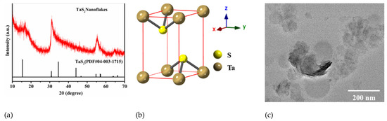 Characterization of the synthesized TaS2 nanoflakes. (a) XRD pattern. (b) Crystal structure. (c) TEM image.