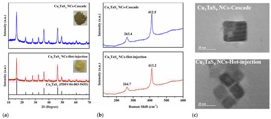 Characterization of Cu3TaS4 NCs prepared by cascade and hot-injection method. (a) XRD pattern. (b) Raman spectra. (c) TEM images.