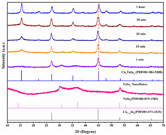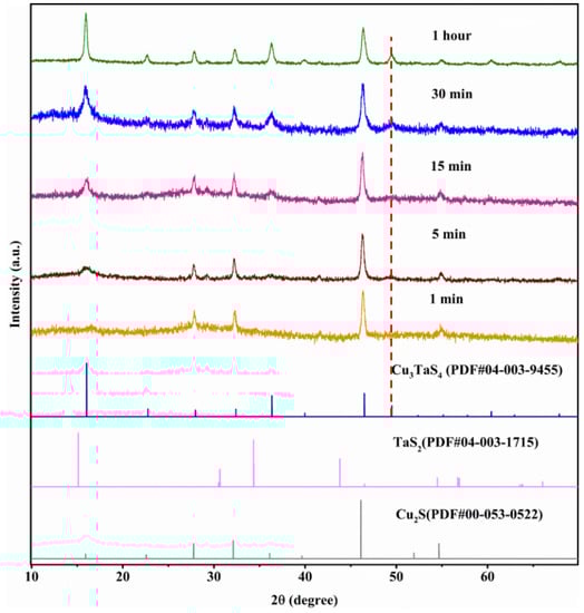 Briefly, the hot-injection method involves the injection of a cold reagent into hot precursors to trigger rapid nucleation which is followed by a crystal growth step. Figure 5 compares the XRD patterns of the Cu3TaS4 NCs products obtained at different reaction times after adding the sulfur source. The color changes of the products are shown in the Supporting Information (Supplementary Materials Figure S2b). Given that the primary XRD peak positions of the Cu2S (PDF# 00-053-0522) are close to those of Cu3TaS4 (PDF# 04-003-9455), we considered the distinguished peak at 49.5° 2θ (marked by the red dotted line) to be the indicative of the presence of the Cu3TaS4. As shown in Figure 5, 1 min after adding the S source into the Cu-Ta precursors, the XRD of the product showed a Cu2S phase. As noted above, after 30 min, a characteristic peak at 49.5° 2θ appeared in the XRD pattern, indicating the formation of the cubic Cu3TaS4 phase. As the reaction progressed, the XRD peaks intensity of Cu3TaS4 gradually increased; at 1 h the intensity of peak at 16.04° grew relatively higher than that of 46.5°, where the peak intensity ratio of 16.04° to 46.5° is close to the indexed patten, indicating the formation of pure phase of Cu3TaS4. Thus, in the hot-injection synthesis of Cu3TaS4 NCs, the swift addition of the sulfur precursor into the Cu-Ta metal precursor at 300 °C triggered the rapid nucleation of Cu2S seeds, and then the formed Cu2S seeds subsequently reacted with Ta cations to form the Cu3TaS4 nanocrystals. Compared with the cascade synthesis of Cu3TaS4 NCs that uses TaS2 nanoflakes as the starting templates, the hot injection method which employs the formed Cu2S as the starting seeds took a longer time to form Cu3TaS4 NCs. We attribute this to the larger radius of Ta cation.