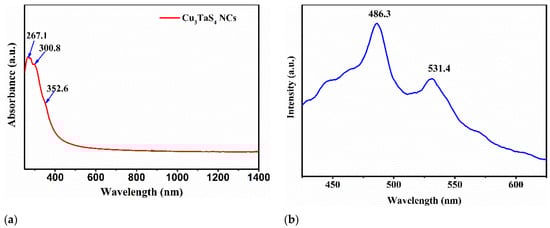 Figure 6a depicts the optical absorption spectrum of the synthesized Cu3TaS4 NCs in the ultraviolet, visible, and near-infrared regions, which shows three absorbance bands at around 267.1, 300.8 and 352.6 nm. Figure 6b shows the photoluminescence (PL) spectrum of the synthesized Cu3TaS4 NCs in ethanol, when using 360 nm as the excitation wavelength, the characteristic emission peaks occurred at 486.3 and 531.4 nm, corresponding to 2.54 eV and 2.33 eV, respectively. The green emission at 531.4 nm indicated a mid-band-gap charge trap caused by Cu vacancies near the valence band maximum, in good agreement with a previous report by Hersh [21], where green photoemission at 548 nm was present for the Cu3TaS4 single crystal.
