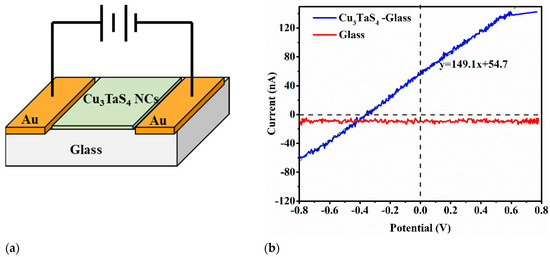 To evaluate the electrical conductivity of the Cu3TaS4 NCs, a Cu3TaS4 NCs-based device with a configuration of Au/Cu3TaS4 NCs-glass/Au was subjected to an I-V measurement. The schematic of the device configuration for the I-V measurement is shown in Figure 7a. The I-V curve of the Au/Cu3TaS4 NCs-glass/Au device is shown in Figure 7b blue line, where the current progressively increases along with the voltage bias towards positive, implying the electrons could flow through the Cu3TaS4 NCs area. Generally, glass is a good insulator that does not allow the flow of electrons, and its conductivity is negligible as compared to the material of the thin films. Thus, it could be concluded that in the Au/Cu3TaS4 NCs-film/Au device, the electrons flow through the Cu3TaS4 NCs thin film rather than the glass substrate. To prove our hypothesis, we prepared a control device configured as Au/Glass/Au, where the two gold electrodes connected only by clean glass. The I-V curves of the control device are shown in Figure 7b red line, where the current is kept at around zero amperes when increasing the voltage, suggesting that no electrons flow through the glass substrate, which further evidence our hypothesis that Cu3TaS4 material has electrical conductivity. The obtained I-V plot of the Au/Cu3TaS4 NCs-glass/Au device allowed us to calculate the electrical conductivity of Cu3TaS4 NCs. Using the equation R = V/I (R-Resistance in ohms(Ω); V-voltage in volts (V); I-current in amperes(A)), we could calculate the resistance of Cu3TaS4 NCs, namely, the slope of the I-V curve, which is 1.49 × 107 Ω. Generally, the electrical conductivity of a thin film (σ) could be determined using the following expression: