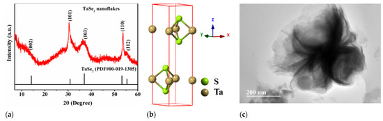 Characterization of synthesized TaSe2 nanoflakes. (a) XRD pattern. (b) Crystal structure. (c) TEM image.