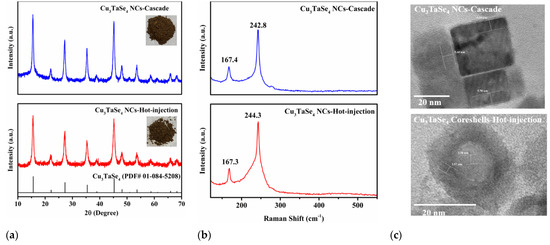 Characterization of Cu3TaSe4 prepared by cascade and hot-injection methods. (a) XRD pattern. (b) Raman spectra. (c) TEM images.