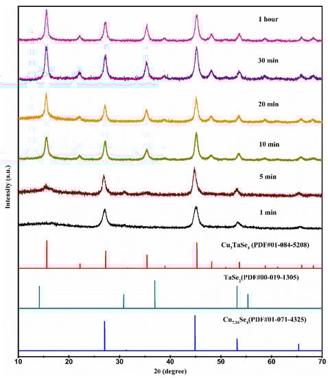 To assess the mechanism of Cu3TaSe4 NCs formation using the hot-injection method, we investigated the XRD patterns and color change of products at different reaction times, as shown in Figure 12 and Figure S4b, respectively. Once injecting the Cu-Ta precursor into the hot selenium solution, the first primary phase of Cu7.16Se4 was observed in the XRD patterns (Figure 12), indicating that the Cu7.16Se4 formed rapidly within 1 min, which was consistent with the cascade synthesis of Cu3TaSe4 NCs. After 5 min, the presence of the XRD peak at 15.64° highlights the formation of the cubic Cu3TaSe4 phase. As the reaction proceeded, the peak intensity ratio of the characteristic peak at 15.64° to 45.26 increased gradually, indicating the progressive conversion from Cu7.16Se4 to cubic Cu3TaSe4. Therefore, we hypothesize that the formation of Cu3TaSe4 NCs could follow the path below.