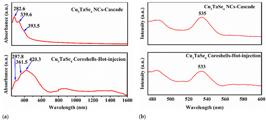 Optical spectra of synthesized Cu3TaSe4 NCs are shown in Figure 13a. The UV-Vis-NIR spectrum of the Cu3TaSe4 NCs prepared by the cascade method shows three primary peaks at around 282.6, 339.6, and 393.5 nm, respectively, whereas the spectrum of the Cu3TaSe4 core-shells exhibits a broad absorbing band at around 420.3 nm with two small characteristic peaks at 297.8 and 361.5 nm. Compared with the Cu3TaSe4 NCs, the UV-Vis-NIR spectrum of Cu3TaSe4 core-shells showed an additional absorption band at around 800-1000nm, which is related to the core-shell structured properties of Cu3TaSe4. Photoluminescence spectra of Cu3TaSe4 prepared by either the cascade method or hot-injection method (Figure 13b) showed a characteristic peak at around 535 nm, suggesting that the optical bandgap of Cu3TaSe4 was 2.32 eV, which is in good agreement with the previous reports [5,21,28,42].The I-V curve of fabricated Au/Cu3TaSe4 NCs-glass/Au device in Figure S5 shows a weak resistance. The electrical conductivity of Au/Cu3TaSe4 NCs-glass/Au device is very low compared to that of Cu3TaS4 NCs based device. Theoretically, the conductivity of semiconductor is proportional to the product of the mobility and the density of carriers. Herein, as p-type semiconductor, the majority carrier in Cu3TaS4 and Cu3TaSe4 semiconductors is the hole, thereby, their conductivity varies depending on the hole mobility and the density of holes. As described in the introduction, the calculated hole effective mass of Cu3TaS4 and Cu3TaSe4 are 0.944 and 0.831 mh*, Cu3TaSe4 has a lighter hole effective mass and should be more likely to display good p-type mobility. However, the defect concentration and the hole concentration could also affect the conductivity of devices. Speculating about the reason for a less conductivity of Au/Cu3TaSe4 NCs-glass/Au device, we could imagine that the fabricated devices would have a high defect density, which would trap the charge carriers or a low hole density of Cu3TaSe4 NCs. Further investigations in future studies are necessary to resolve the reason for the low conductivity, such as improving the thin-film quality.