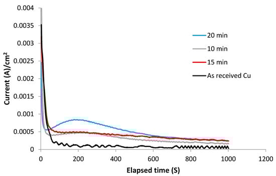 Cu foil with a surface area of 1 cm2 was polished using emery papers of different grades, then washed using distilled water, and dried using a high-pressure air jet. The foil was then washed using dilute acetic acid to remove any Cu oxide []. After washing it with distilled water, the Cu foil was then immersed in acetone for 15 min to remove any organic impurities or contaminations, followed by cleaning with both methanol and distilled water for a further 15 min.