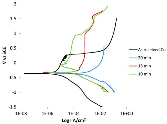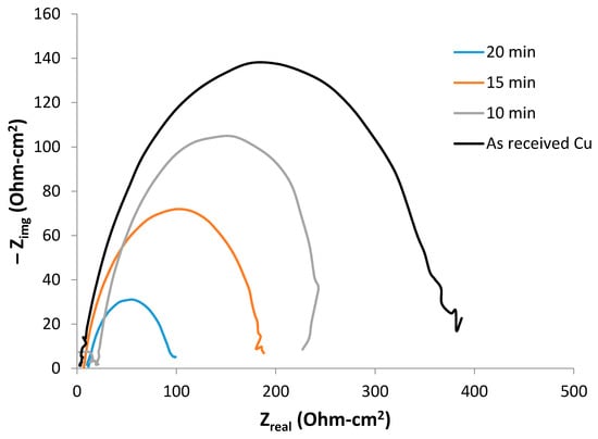 It is clear from the Nyquist plots that upon an increase in the deposition, there is a decrease in the diameter of the capacitive loop, with the smallest diameter observed for the sample with the longest deposition time of 20 min and the as-received Cu sample exhibiting the capacitive loop with the largest diameter. As previously stated, the Rct value is inversely proportional to the icorr value, where the values presented in Table 1 and Table 2 show the same trend. The sample coated for 20 min shows the lowest Rct value and thus its corrosion resistance properties, indicated by its icorr value, are the worst of all the samples.