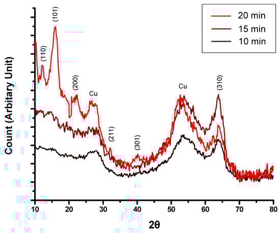 Figure 6 shows the PXRD patterns of the SnO2-coated Cu electrodes deposited over different time periods. All of the peaks in the patterns were indexed and identified using the matching elements function of the diffractometer library with. A tetragonal SnO2 phase (JCPDS Card #41-1445) was clearly detected alongside Cu substrate peaks. Well-defined diffraction patterns were easily obtained, even at a low temperature, and their peaks assigned, indicating the formation of crystalline SnO2 films, and confirming that the crystal structure of SnO2 was retained after the deposition process was carried out.