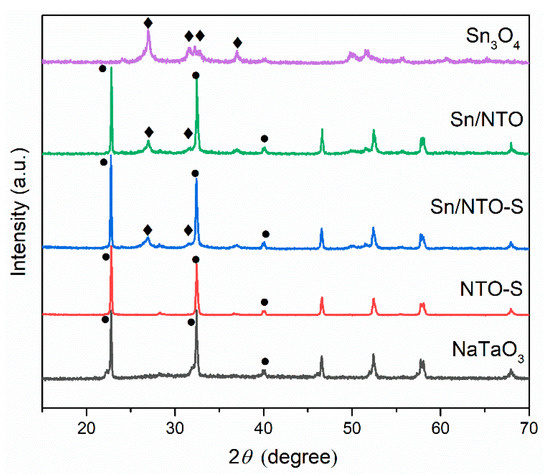XRD patterns of as-obtained samples: NaTaO3, NTO-S, Sn/NTO, Sn/NTO-S composites, and Sn3O4.