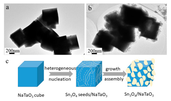 TEM images of NaTaO3 (a), Sn/NTO (b), and a schematic diagram of the growth process of Sn/NTO (c).
