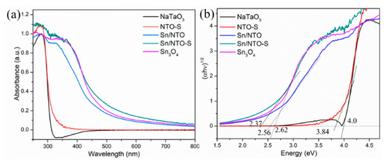 UV–vis diffuse reflectance spectra (DRS) (a) and the calculated band gaps (b) of different samples: NaTaO3, NTO-S, Sn/NTO, Sn/NTO-S (molar ratio Sn:Ta = 1:1) heterostructure, and Sn3O4.