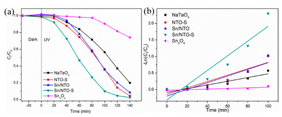 Photocatalytic degradation activities (a) and plots (b) of –Ln (Ct/C0) vs. irradiation time for RhB degradation under ultraviolet light irradiation, measured at regular time intervals in the presence of NaTaO3, NTO-S, Sn/NTO, Sn/NTO-S, and Sn3O4, respectively.