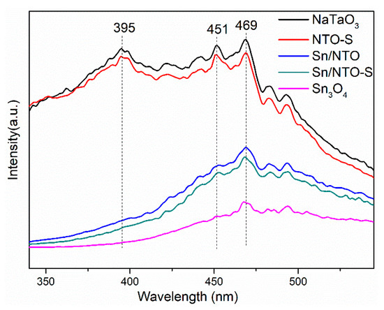 To prove the rationality of the proposed reaction pathway and investigate the capabilities of photo-induced e−/h+ pairs in the semiconductors, PL emission spectra of NaTaO3, NTO-S, Sn/NTO, Sn/NTO-S, and Sn3O4 were carried out, respectively. PL emission arises from the recombination of free carriers, and a higher PL intensity reveals a higher recombination rate of photogenerated e−/h+ pairs. By contrast, a weaker PL intensity indicates a lower recombination rate of photo-excited e−/h+ pairs, and accordingly, much more photo-induced carriers can participate in the photocatalytic reaction [10,34]. As shown in Figure 6, the spectrum of NaTaO3 nanocubes showed three peaks at around 395 nm, 451 nm, and 469 nm. The emission at 451 nm and 469 nm was due to band-to-band mixing of Ta4+-O− states in the octahedral TaO6 motifs of NaTaO3 [48]. After doping the S anion in NaTaO3, the PL intensity of NTO-S was weaker than that of pure NaTaO3. It indicated that the NTO-S could suppress the recombination of e−/h+ pairs. Noticeably, the intensities of the PL spectra of Sn/NTO and the Sn/NTO-S heterojunction photocatalysts strongly decreased with the Sn/NTO heterojunctions formed as compared to pure cubic NaTaO3; this can be seen at the maximum PL intensity at around 469 nm. The lower PL intensity implied the efficient inhibition of photogenerated pairs and therefore higher photocatalytic activity in the UV light region, which could effectively explain the variation of the photocatalytic activities of the different samples.