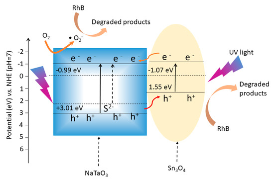 To the best of our knowledge, there is no research on the photocatalytic performance of the Sn3O4/NaTaO3 heterostructure. Therefore, in the current work, sulfur-doped NaTaO3 cubes were synthesized to modify the band structure of NaTaO3. Based on the appropriate valance band (EVB ~3.01 eV) and conduction band edge (ECB ~0.99 eV) of NaTaO3 [12,28], which can match well with that of Sn3O4 (EVB ~1.07 eV and ECB ~1.55 eV vs. NHE, pH = 7) [30], the heterojunction of Sn3O4/NaTaO3 was synthesized. An enhanced photo-induced charge separation was highly expected, which results in the enhanced photocatalytic degradation of RhB. This work provides an ordinary and low-cost method for the large-scale production of NaTaO3-based materials in various applications. It is expected to offer an upfront approach for developing highly stable and effective heterostructures for organic pollutant degradation.