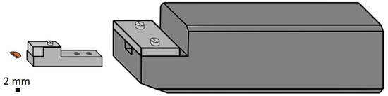 Furthermore, it is essential to fabricate the samples with a well-defined orientation in a rigorous coordinate system and avoid all geometrical deficiencies. At the same time, the specimens should be transferrable between the FIB employed for specimen fabrication, the dedicated in-situ testing scanning electron microscope (SEM, DSM982, Carl Zeiss AG, Oberkochen, Germany), as well as the TEM (JEM 2100F, Jeol Ltd., Tokyo, Japan) for additional high resolution characterisation. Thus, we developed a staggered holder design as shown in Figure 2. The actual TEM-inspired sample has a flat along its circumference to ensure rotational alignment. Thus, even after repeated placement in a TEM, rotational alignment is kept [26]. This half-disk is mounted in a holder suited to fit the Bruker Hysitron Picoindenter PI-85 SEM as well as the PI-95 TEM nanoindenter with a clamping grip. As stated before, with the rotational degree of freedom fixed, the alignment during uniaxial testing is given. Finally, this whole SEM/TEM testing compatible holder can be placed in a larger mounting device that is on the one hand compatible to the Asmec UNAT 1 in-situ SEM microindenter, while on the other hand, this holder is used for the FIB processing, as it allows for controlled rotations of the mounted sample by ±45° and ±90°, as well as tilt along the long axis by 90°. Thus, by re-mounting the specimen at various tilts, perfect rectangular and orthogonal specimens with constant sample cross-sections can be fabricated. Moreover, utilising the ±45° tilts allows the specimens to be rotated by 45° with respect to the wedge, which provides a view on two faces rather than a single one during in-situ testing, which is a particular benefit during in-situ SEM testing [4,5].
