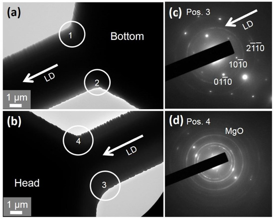The transferable sample mounting scheme proves a valuable asset also to examine the initial crystal orientation. Deviations from the planned crystallography could cause activation of unintended slip systems. So could the presence of unnoticed growth twins or occurring small angle boundaries [29]. While the crystallographic orientation of the specimen can be routinely accessed using electron backscatter diffraction (EBSD), with some effort even in a quasi in-situ manner [11], the orientation information from diffraction information in the TEM is much more sensitive, in particular with respect to low angle crystal defects that are challenging to resolve by standard EBSD. Furthermore, the effect of surface oxides or presence of initial dislocations can be easily assessed. Here, the specimens were routinely analysed using TEM, and an example for a 4-µm Mg tensile specimen is shown in Figure 3. Of course the sample is not fully electron transparent over the entire cross-section, but the whole length along both edges can be inspected for crystallographic defects, as exemplarily shown in Figure 3a,b for the bottom and head part of the sample, and the diffraction information in these regions is assessable, as shown for regions 3 and 4 in Figure 3c,d, to detail the crystallographic loading direction. In analogy, samples can be inspected post testing in the TEM.