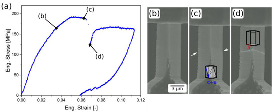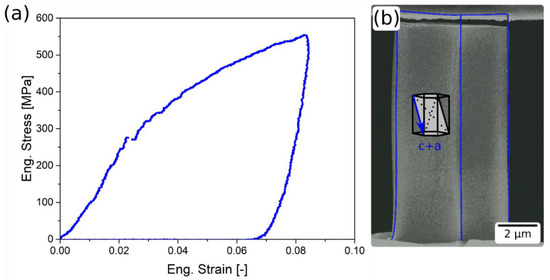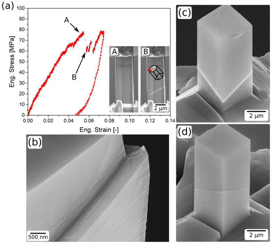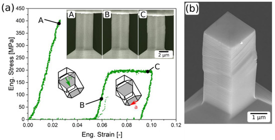 To compare the tensile twinning observed in tension to the activation of the same mechanism in compression, the last example concerns a miniaturised compression test of a 2-µm wide specimen along the direction. For this crystallographic orientation, due to the specific crystal rotation created by the twin, lateral confinement effects should be less pronounced and thus also allow twinning to take place during compression. In fact, this specific orientation was previously studied by our group in a combined in-situ SEM and in-situ TEM fashion and we will therefore be rather brief and only mention the essential facts, while all details can be found elsewhere [39]. In Figure 9a, we again observe a clear elastic regime followed by a distinct burst and load drop at a stress of about 400 MPa, followed by an overshoot of the indenter due to a not sufficiently fast feedback control, thereby releasing the strain energy stored in the system. Distinct distortion of the specimen geometry, in fact a slight kink of the top part due to the twinning reorientation by 86°, is seen in point B in the inset upon elastic reloading. Thus, we can assign this again to the nucleation and propagation of a tensile twin. After elastic reloading, we observe a constant stress plateau at ~200 MPa, where slip steps emerge as seen in the inset corresponding to point C along the stress–strain data. This corresponds to basal slip in the twinned part of the specimen, as reported earlier [39]. In Figure 9b an inclined post mortem SEM image shows the slip steps in more detail.