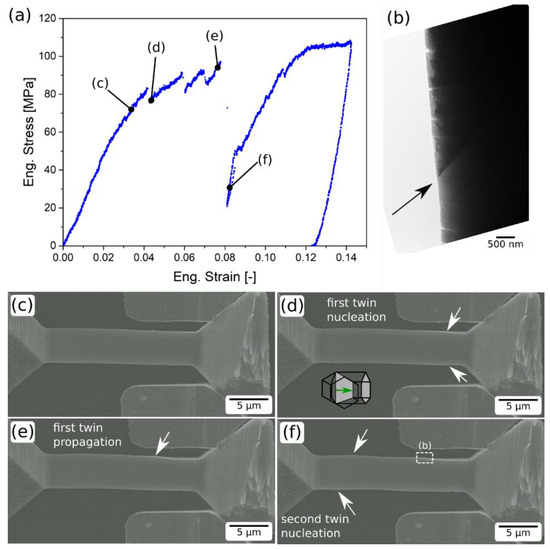 Coming back to the previously mentioned aspect of confinement effects on twinning, we conducted related micro-tensile tests on an crystal orientation using a 4-µm tensile sample in Figure 8, as this would permit the formation of a tension twin. As reported earlier, the longer aspect ratio tensile geometry is more compliant and allows for lateral adjustments [38]. In Figure 8a, we observe an elastic–plastic transition followed by a rather constant flow stress in the range of 80 to 90 MPa. This corresponds well to the nucleation and growth of a tensile twin seen in in Figure 8d,e. The pronounced load drop at a strain of 0.08 relates to the nucleation of a second tensile twin on the left hand side of the tensile specimen, as also indicated in the in-situ image shown as Figure 8f. Taking the specimen back into the TEM after unloading, in Figure 8b we observe the distinct crystal orientation change at the twin front in the area indicated by a dashed rectangle in Figure 8f. Thus, this setup allows for the unhindered nucleation and propagation of tensile twins.