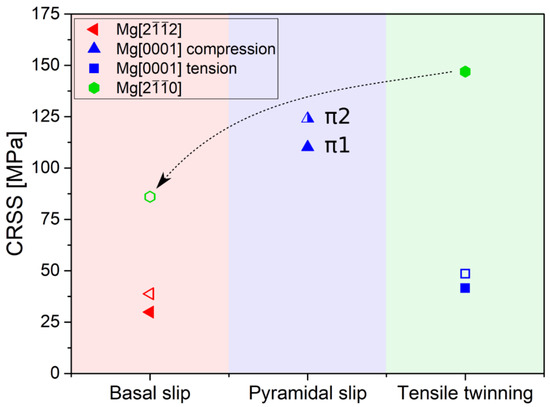 Critical resolved shear stresses (CRSS) of the previously detailed samples with regard to deformation mechanisms. The filled symbols represent initial deviation of the elastic load-displacement regime, while the open symbols depict evident deformation features, such as large load drops, which correspond to the respective mechanisms. For the Mg[0001] compression specimen, CRSS was calculated for both pyramidal planes (π1, π2) for comparison.