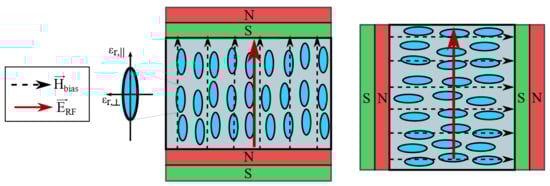 Bias of a volume of liquid crystal (LC) with magnets. The LC molecules are represented as rod-like forms, showing a long and a short axis. Depending on the molecules’ orientation with respect to the LC volume shows different macroscopic permittivity, (left) or (right), to an electromagnetic wave.