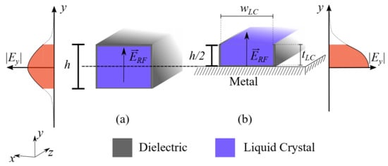 Dielectric image guides (DIGs) have been proposed for mmW circuits starting in the 1950s, and continued to be of interest during the following decades [17,18,19]. However, since the need for high data rate communications was not as demanding at that time as it is today, DIGs were not further investigated. In recent years, however, DIGs have been in renewed focus of research [20,21,22]. Figure 2 depicts the cross section of an LC-based DIG compared to an LC-based fully dielectric waveguide. The effective permittivity of the waveguides changes if the LC molecule orientation with respect to the RF-polarization () changes. Hence, by controlling the permittivity, a phase shift of the propagating RF wave can be achieved in a continuous manner by changing the orientation between LC molecules and accordingly. Dielectric structures can show low loss even at higher frequencies, as parts of the propagating wave are present as evanescent field components outside the dielectric waveguide. The height of the fully dielectric guide can be effectively reduced by a factor of two by introducing a metallic image plane, which results in mechanical stability and faster response time of the DIG phase shifter when compared to its fully dielectric counterpart [15]. In its fundamental mode of operation, the -mode, is perpendicular to the ground plane. Therefore, when considering practical applications, the contact between image guide and ground has to be ensured for predictable operation of the image guide. In [15], the disturbing effect of this air gap in a first demonstrator of an LC-based DIG phase shifter is stated. It has to be eliminated when aiming for a proper temperature characterization of the component. Since the DIG used in this paper is mechanically fabricated from Rexolite, which has a relative permittivity of and a loss tangent of at 95 [23], a glue with similar permittivity and low loss should be used to adhere the DIG to the ground plane.