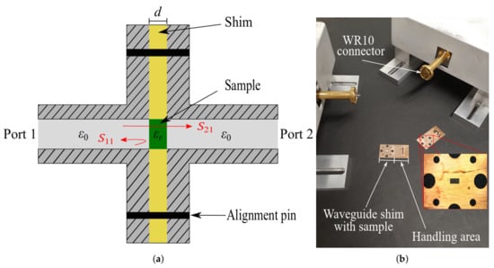 Characterization of adhesive is challenging since the adhesive has to cure before a solid form can be used for common characterization setups. Especially at frequencies towards 100 , the small dimensions can pose a non-negligible problem. We meet this problem by filling a WR10 waveguide shim of known thickness d with adhesive and let it cure inside the shim. The shim can then be inserted between two standard WR10 hollow waveguides. Therefore, as d is known, permittivity and loss can be extracted by measuring the insertion and return loss. In particular, we use the Nicholson–Ross–Weir (NRW) method [24,25], which has been successfully used for materials which have to cure [26]. Figure 3 depicts a schematic of the measurement principle as well as a photograph of the measurement setup. The shims are cut by a laser from Tombak and have a thickness of .