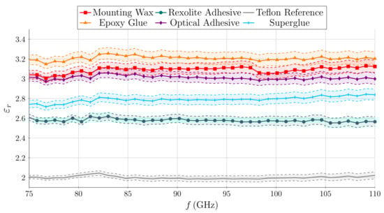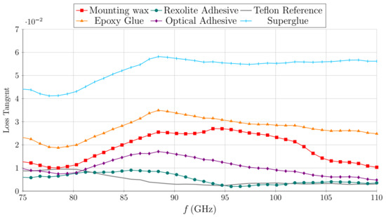 After filling and curing of the glue the shim is carefully cleaned using acetone and polished, such that a flat surface of the material is ensured. In total, five adhesives—Pattex Plastix superglue, UHU PLUS Sofortfest epoxy glue, Rexolilte Adhesive 12,517, Norland Optical Adhesive 81 and QuickStick 135 Temporary Mounting Wax—together with one reference material, Teflon, have been characterized. The obtained results regarding permittivity are depicted in Figure 4. In general, all characterized adhesives are in the range of the relative permittivity of Rexolite (), with epoxy glue being the most different in permittivity with a maximum difference of 0.7. Figure 5 shows a clear difference in loss tangent of the adhesives. It has to be stated that the NRW approach can only provide well reliable results for lossy materials due to its broadband nature. For precise measurement of loss, resonance methods should be used. Using the NRW approach, noise or small deviations in the measured can cause an increase or decrease in the extracted loss tangent and limits resolution [27,28]. Especially for low-loss materials (Teflon reference and Rexolite adhesive) higher loss than given in literature for Teflon and solid Rexolite is obtained [29]. The results shown in Figure 5 are therefore not a highly precise determination of the loss tangent of the adhesives, but an evaluation of the loss of the adhesives compared to each other and are included for the sake of completeness. With the obtained results of permittivity and loss tangent, the clear difference in adhesives indicates that Rexolite glue is most suitable for adhering the DIG to the metallic ground plane. However, it was found during measurements that Rexolite glue has low adhesion on metal. While in the following temperature measurement setup the glue is mostly necessary to eliminate a possible air gap, and additional mechanical support is applied by the setup itself, we advise to use the optical adhesive if strong mechanical stability is desired.