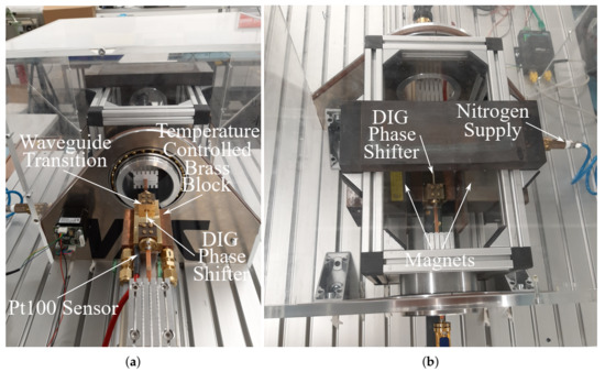 Figure 7 shows the temperature characterization setup. A brass block forms the ground plane on which the DIG is placed. A Pt100 temperature sensor is inserted in the brass ground plane in order to monitor the temperature in the ground plane. Since the DIG phase shifter is directly placed on the ground plane, this is the best position for temperature reading without disturbing the propagating RF-wave. In order to heat or cool the ground plane, it is mounted on a copper block with fluidic channels connected to a Julabo FP50 temperature controller. With corresponding feedback from the temperature sensor a stable temperature in the ground plane is maintained by the Julabo FP50. The nematic LC used for the measurements is GT-7 29001, which shows a parallel permittivity of with an accompanied loss tangent of and a perpendicular permittivity of with an accompanied loss tangent of (data provided by Merck KGaA at 19 ). Hence, the anisotropy of the LC-mixture is . After filling the DIG structure and connecting the measurement equipment to the waveguide transitions, the temperature control setup (Figure 7a) is inserted into a fixture with rotatable magnets. The magnets provide a magnetic flux density of , such that both parallel and perpendicular permittivity of the LC-mixture can be stimulated (Figure 7b). The rotatable magnets are enclosed by a transparent plastic box. A steady flow of nitrogen in box prevents moist or frost on the structure. The overall temperature range from −10 to 80 is limited by the capabilities the Rexolite material, which starts to degrade at higher temperatures than 80 , and the warming of the fluid along its way from Julabo FP50 to the structure when cooling the device.
