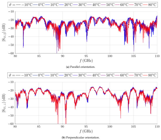Figure 8, Figure 9 and Figure 10 show the obtained measurement results at different temperatures . Figure 8 illustrates the matching of the phase shifter. Matching with is achieved at all investigated frequencies. Only slight deviations in can be observed with temperature and no significant difference in behavior for parallel or perpendicular LC alignment with respect to the RF-polarization can be made.