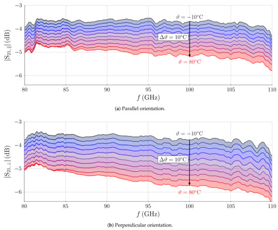 In contrast, a clear trend in transmission behavior can be observed, as Figure 9 shows. A magnitude offset in the frequency characteristic of with temperature both in parallel and perpendicular LC orientation is noticed. This offset is almost constant across all frequencies. In the investigated temperature range, the maximum offset is ca. in parallel orientation and ca. in perpendicular orientation. A solid Rexolite DIG has been measured in the same setup in order to assess the influence on on the conductor loss of the ground plane. It was found that a temperature change from to influences the loss of the line itself by maximally . Hence an uncertainty of about is present per 10 temperature change in the graphs depicted in Figure 9. In total, the maximum increase in insertion loss by is defined by the perpendicular alignment at 100 when comparing the measurement at to the one at .