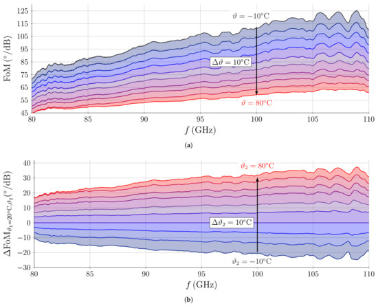 The FoM with respect to temperature is depicted in Figure 11a. Since both and degrade with temperature, the overall FoM degrades as well according to Equation (4). The maximum FoM of / at 109 and is reduced to / at . The difference in FoM is depicted in Figure 11b. We can observe that the FoM degrades by / to 8/ per 10 temperature increase.