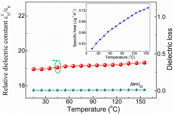 To evaluate the pyroelectric performance of BZBO crystals, the dielectric and thermal expansion behaviours, as a function of temperature, were investigated over the temperature range of 15 °C to 155 °C, and the result is presented in Figure 2. It was observed that the relative dielectric constant, dielectric loss and specific heat of BZBO crystals increased with increasing temperature, exhibiting a positive variation. According to the computational equation, we can infer that the FOMs value should be decreased with increases in temperature.