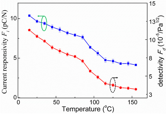 Based on the dielectric and thermal expansion properties of BZBO crystals, the temperature dependence of the FOMs value was investigated over the temperature range of 15~155 °C, including current responsivity Fi and detectivity Fd, and the result is shown in Figure 3. The Fi and Fd were decreased when the temperature increased, where the Fi was 10.38 pm/V at 15 °C and 4.14 pm/V at 155 °C. The detectivety Fd was 11.31 × 10−5/Pa1/2 at 15 °C and decreased to 3.20 × 10−5/Pa1/2 when the temperature was at 155 °C.