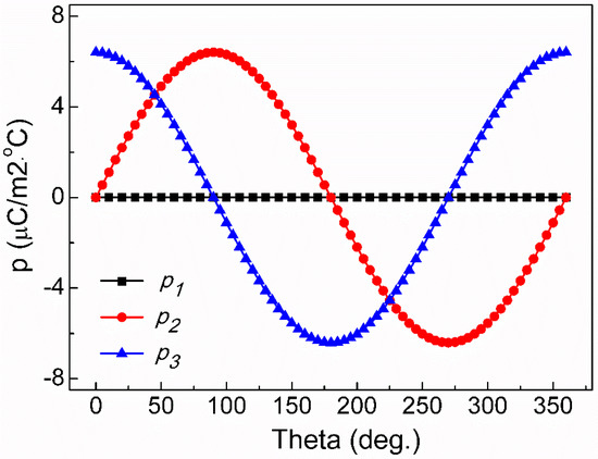 In view of the good pyroelectric performance of BZBO crystals, the orientation dependence of the pyroelectric coefficient was discussed in accordance with coordinate rotation. Figure 4 presented the variation of the pyroelectric coefficient pi with the rotation angle around the X-axis. It can be observed that when the angles were 0°, 90°, 180°, 270° and 360°, the pi reached the maximum, being on the order of 6.41 µC/(m2·°C).