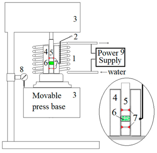 The CSP setup: 1—coil induction heater; 2—thermocouple; 3—hydraulic press; 4—die mold; 5—set of punches; 6—ZnO powder; 7—seal rings; 8—motion sensor; 9—Power Supply.